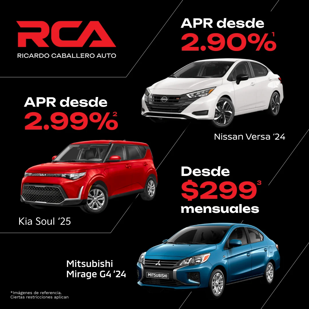 Financiamiento ofrecido por Banco Popular de Puerto Rico. Miembro FDIC. Sujeto a aprobación de crédito. Ciertas restricciones aplican. Oferta válida hasta el 31 de agosto de 2025. ¹Ej. Mitsubishi Mirage G4 2024 (35/41 MPG): Precio: $19,995; Pronto: $0; Balance a Financiar: $19,995; 72 pagos mensuales de $299 al 2.46% APR. Oferta aplica a clientes con puntuación de riesgo de 795 en adelante y que se acojan a pago directo. ²Oferta desde 2.90% APR aplica a clientes con puntuación de crédito de 795 en adelante para modelo Nissan Versa 2024 (32/40 MPG). Oferta aplica a préstamo de auto convencional y al acogerse a pago directo. ³Oferta desde 2.99% APR aplica a clientes con puntuación de crédito de 795 en adelante para modelo Kia Soul 2025 (27/33 MPG). Oferta aplica a préstamo de auto convencional y al acogerse a pago directo. Popular Auto y Ricardo Caballero no son afiliados.